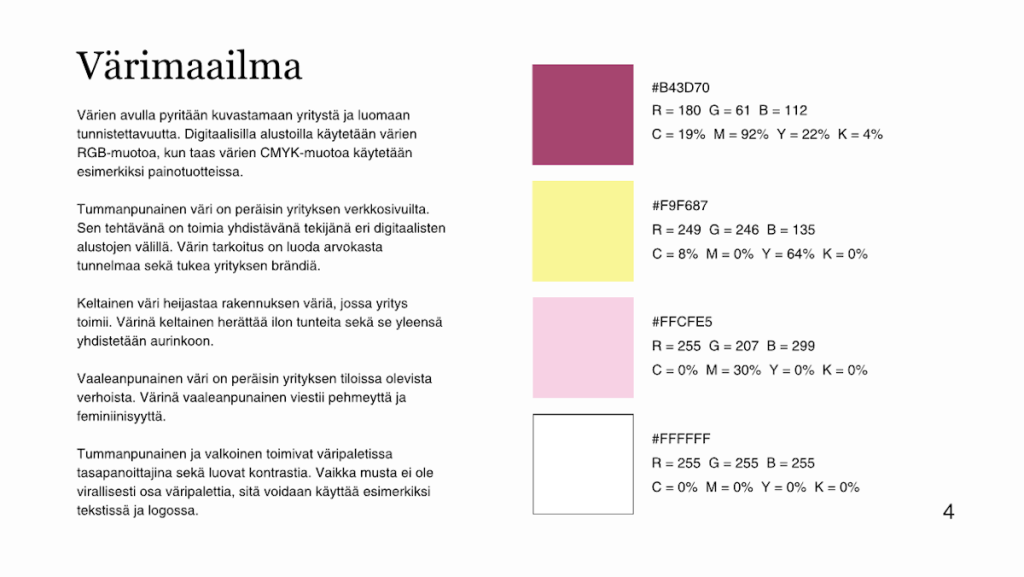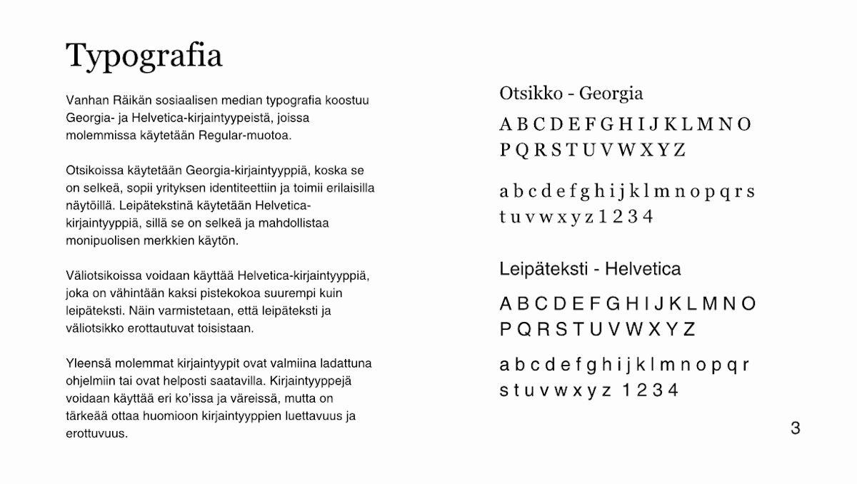Seuraavaksi tein työn kirjallisuuskatsauksen sekä aloin suunnitella toiminnallista osuutta eli itse ohjeistusta. Ohjeistus sisälsi typografian, väripaletin, sisällön määrittelyn sekä julkaisupohjien ja mallipohjien toteutuksen. Vanha Räikkä hyväksyi suunnitelman ja antoi minulle suhteellisen vapaat kädet ohjeistuksen tekemiseen.