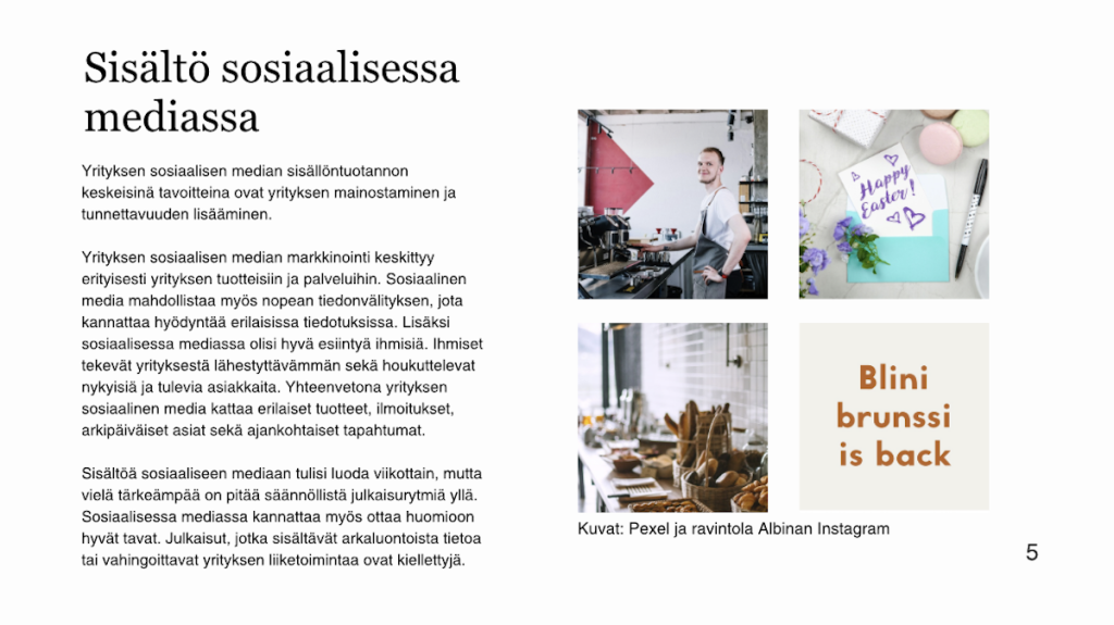 Kaiken kaikkiaan opinnäytetyö oli minulle erittäin opettavainen prosessi. Opin muun muassa teoreettista tietoa visuaalisesta viestinnästä ja sosiaalisen median ilmeestä sekä käytännön taitoja asiakastyöskentelystä ja projektinhallinnasta.